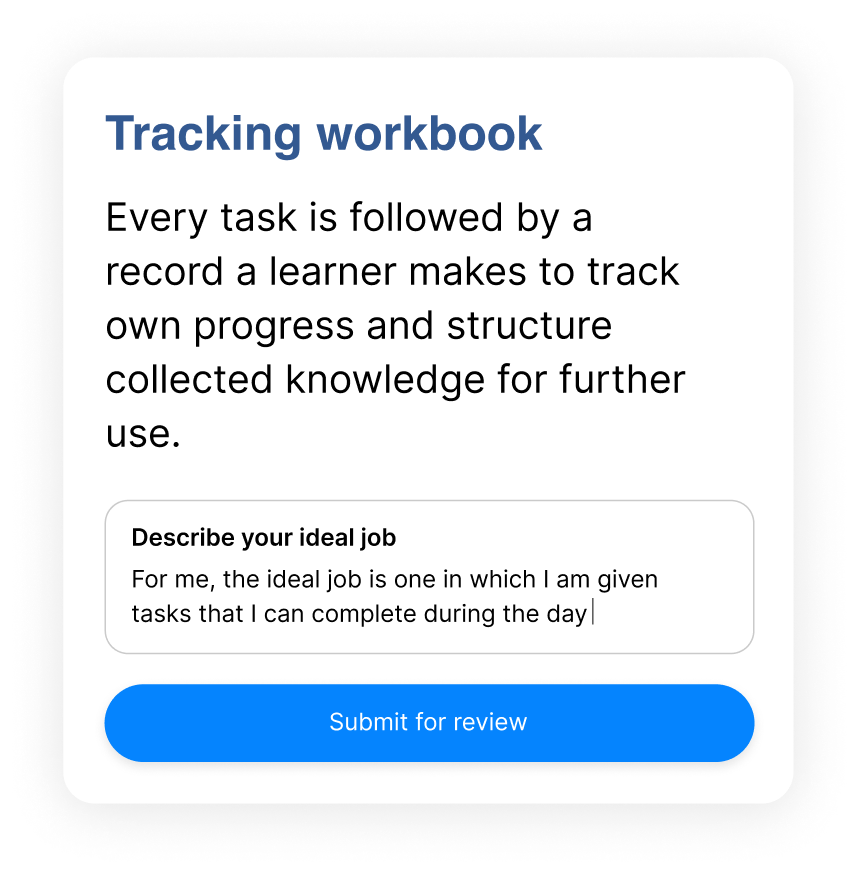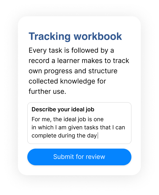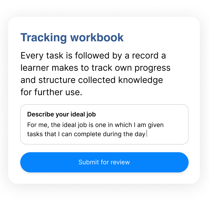 Our learning platform consists of five components which facilitate efficient learning: practical real-life tasks, personalized assignments, reflecting on them, and communicating with a mentor.